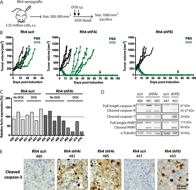 Figure 4: Induction of furin silencing results in remission of Rh4 tumors in vivo. A. Schematic overview of Rh4 xenograft model. 3-5 NOD/SCID mice per group were engrafted s.c. with 3.25 million Rh4 cells. Expression of shRNA was induced through administration of DOX (i.p. injection of 53 mg/kg DOX on two consecutive days combined with DOX-supplemented food) once a tumor size of 200-300 mm3 was reached. Mice were sacrificed upon a tumor size of 1000 mm3. B. Tumor growth over time as monitored by caliper measurements in Rh4 xenografts. Arrows indicate that mice were put back on normal food approximately 60 days post onset of remission. C. Furin mRNA levels in Rh4 tumors. Tumor tissue was collected at sacrifice, total RNA isolated and furin mRNA levels analyzed by qRT-PCR. D–E. Apoptotic markers in Rh4 tumors after 5 days of DOX treatment. D) Caspase-9, cleaved caspase-7 and PARP levels were examined by Western blot. E) Levels of cleaved caspase-3 were analyzed by immunohistochemistry.