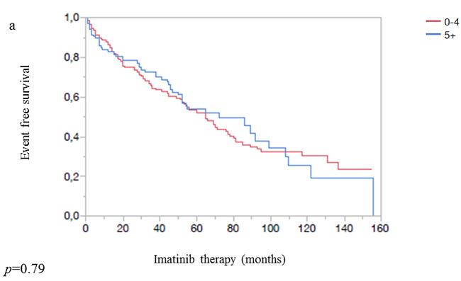 Overall survival was calculated from the date of imatinib start until death due to any cause. Event-free survival was calculated from the date of imatinib start to any of the following events: primary hematological resistance to imatinib, definitive imatinib discontinuation due to toxicity or any other cause, secondary hematological or cytogenetic resistance to imatinib or death due to any cause.
