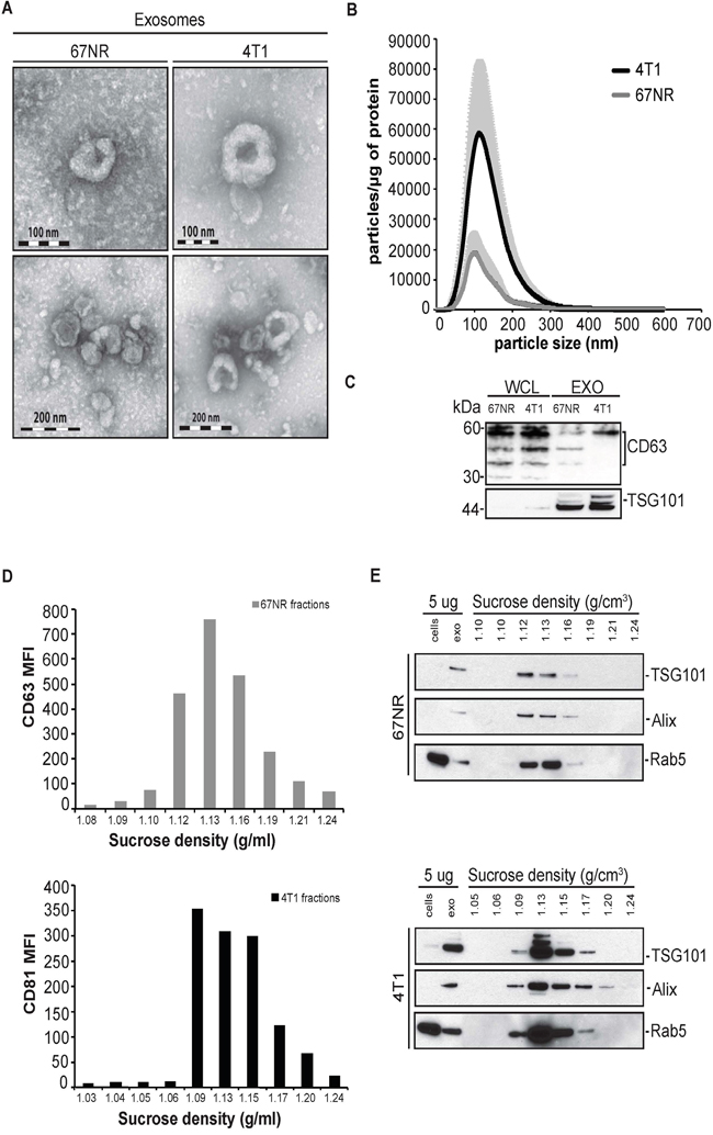 Figure 1: Characterization of extracellular vesicles secreted from non-metastatic mouse breast cancer cell line 67NR and metastatic mouse breast cancer cell line 4T1. A. Electron microscopy of 4T1 and 67NR ultracentrifuged pellets revealed the characteristic shape and size of exosomes (n=1). B. Nanoparticle Tracking Analysis (NTA) of particles secreted from 67NR and 4T1 cell lines. The relative concentration of secreted particles (106 particles/ml), which obtained from Nanosight was normalized with mg of proteins of cell lysates (means +/- SD, n=3, 5x1 minute movies sequences were measured). C. Western blot analysis of lysates from 67NR and 4T1 cells and exosomes (15μg respectively) probed for a panel of exosomal markers (CD63 and TSG101) (n=2). D. Flow cytometric analysis of the mean fluorescence analysis of sucrose gradient fractions, for CD81 and CD63 exosomal markers, from 4T1 and 67NR pellets, respectively (n=2, in triplicates). E. Western blot analysis of the sucrose gradient fractions from 4T1 and 67NR exosomes (15μg respectively), probed for TSG101, Alix and Rab5 (n=2).