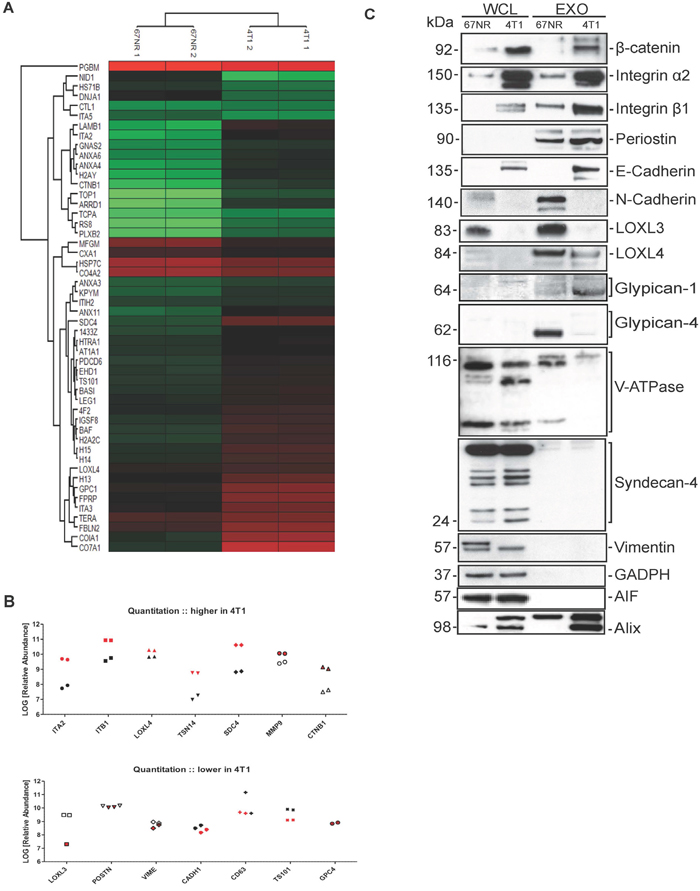 We performed a hierarchical unsupervised clustering of proteins depicted as a heat map of proteins enriched in 67NR and 4T1 exosomes, and found significant differences in protein expression (Figure 2A, top 50 proteins presented). We quantified the abundance levels by using ANOVA pairwise comparisons and selected the proteins that show the biggest difference in abundance levels between the 67NR and 4T1 exosomes (Figure 2B). We then validated by western blotting the top 20 proteins which were revealed by proteomic and gene ontology analysis (Figure 2C). The proteins that were found to be more abundant in 4T1 exosomes in both proteomic analyses are β-Catenin and integrin-α2 and integrin-β1 (Figure 2B and 2C). Interestingly, we found an enrichement of periostin in 4T1 compared to 67NR exosomes (Figure 2C). Furthermore, we found that E-cadherin is expressed in both 4T1 cells and exosomes and N-cadherin is mainly expressed in 67NR cells (Figure 2C). Regarding Lysyl oxidase like enzymes, we found that LOXL4 was present in lower levels in 4T1 cells and exosomes than in 67NR cells and exosomes (Figure 2C). LOXL3 could only be detected in 67NR cells and exosomes (Figure 2B and 2C). In this study, the expression of glypican-1 was enriched in 4T1 exosomes and glypican-4 in 67NR exosomes (Figure 2C). The levels of V-ATPase were the same in both 67NR and 4T1 cell lines and in 4T1 exosomes the levels of V-ATPase were lower than in 67NR exosomes (Figure 2C). Finally, we did not detect syndecan-4 and vimentin in neither 67NR nor 4T1 exosomes and the enrichment was found to be equal in 67NR and 4T1 cells (Figure 2C). Programmed Cell death Interacting Protein (Alix) was used as an exosomal marker, as a control of the purity of exosomal isolation we used AIF and GAPDH as a loading control for the whole cell lysates (Figure 2C). Summarizing, we confirmed by western blot analysis, the differential proteomic content of 67NR and 4T1 exosomes, identifying β-catenin, integrin α2 and β1, periostin and E-Cadherin, as putative markers of metastasis in mouse mammary carcinoma cell lines.