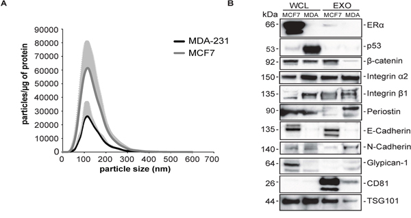 Nanoparticle tracking analysis showed that MCF7 and MDA-MB-231 have the characteristic mean size of exosomes 108 and 106nm respectively with MCF-7 cells secreting more vesicles than the MDA-MB-231 cells (Figure 3A). We examined the presence of ERα in these exosomes and we found ERα in MCF7 cells and exosomes in low levels and, as expected, not in MDA-MB-231 cells and exosomes (Figure 3B). Furthermore, we found the accumulated mutant p53 in MDA-MB-231 cells but not in exosomes (Figure 3B). Periostin and integrin-β1 were enriched in the MDA-MB-231-derived exosomes compared to the MCF7 ones (Figure 3B). β-catenin was expressed in MDA-MB-231 cells but not in their corresponding exosomes, whereas integrin α2 protein levels were similar in the exosomes secreted from metastatic (MDA-MB-231) and non-metastatic cell lines (MCF7) (Figure 3B). Regarding E- and N-Cadherin, we found that MCF7 cells express E-cadherin, whereas MDA-MB-231 cells do not, N-Cadherin levels are higher in MDA-MB-231 exosomes compared to MCF-7 (Figure 3B). CD81 and TSG101 were used as exosomal markers and they were detectable in both exosomes from MCF7 and MDA-MB-231 cell lines. CD81 was highly enriched in exosomes compared to their corresponding exosomes, whereas TSG101 was detectable in the cells and present in their corresponding exosomes (Figure 3B).