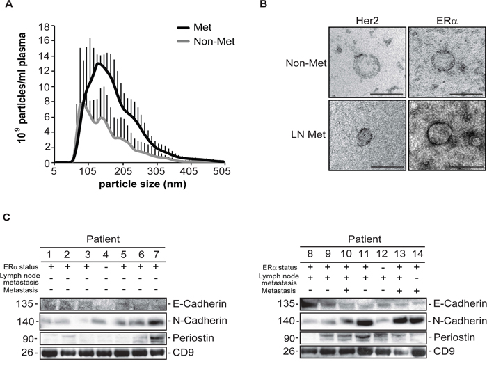 Figure 4: Characterization and validation of exosomes isolated from patients with non-metastatic or metastatic breast cancer. A. Nanoparticle Tracking Analysis (NTA) of particles isolated from patients’ plasma with early or late metastatic breast cancer (means +/- SD, 3 patients with early disease and 3 patients with lymph node metastasis, n=1). B. Immuno-EM of exosomes isolated from patient samples, for the indicated proteins. (Scale bar: 100nm) C. Western blot analysis of exosomes (15 μg) secreted from patients with non- or lymph node metastasis, probed for the indicated proteins (n=3).