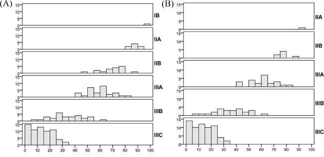 The MSKCC nomogram for GC has been widely validated and manifests a high predictive accuracy. Risk stratification is one function of this nomogram, which may help to select patients for postoperative therapy. Based on the results of the ARTIST trial, the subsequent ARTIST-2 trial [25] enrolls patients after D2 and R0 resection with pathologic stage II or III disease and positive lymph nodes. However, patients who meet this eligibility criteria have different nomogram-predicted 5-year DSS rates (Figure 2B). Specifically, most patients with stage IIA, IIB, or IIIA disease have a 5-year DSS of more than 50%, and the gap between the actual and predicted 5-year DSS is not as large as that of patients who have a 5-year DSS of less than 50%. This finding, to some extent, indicates that selecting patients only based on disease stage and lymph node status may be inefficient. Nevertheless, the ARTIST-2 trial may answer this question in the future. In contrast, a nomogram would increase the precision of patient selection because it incorporates multiple aforementioned clinicpathologic factors.