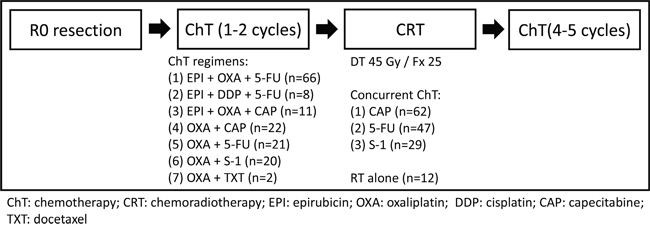 The majority of patients (n=66) received EPI and OXA with 5-FU. The other patients received EPI and DDP with 5-FU (n=8), EPI and OXA with capecitabine (n=11), OXA with 5-FU (n=21), S-1 with OXA (n=20), capecitabine with OXA (n=22), and docetaxel with OXA (n=2). Fluorouracil-based ChT was concurrently used with RT, which included a continuous intravenous infusion of 225 mg/m2 of 5-FU for 120 hours each week (n=47), 625 mg/m2 capecitabine twice daily during RT (n=62) or 40 mg/m2 S-1 b.i.d. daily during RT (n=29). The remaining patients (n=12) received RT without concurrent ChT in consideration of the toxicities and tolerance of treatment.