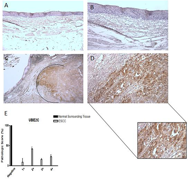 Figure 2: UBE2C protein expression pattern in esophageal squamous cell carcinomas (ESCC). Representative immunohistochemistry micrographs of histologically normal surrounding mucosa showing negative staining for UBE2C A. – 100X magnification and B. – 200X magnification) and of ESCC sample positively stained for UBE2C C. – 25X magnification and D. – 200X magnification). In the detail, a zoom of the ESCC invasion front, highly positive for UBE2C staining. E. Graphical representation of the 22 ESCC samples and their respective normal surrounding mucosas staining score.