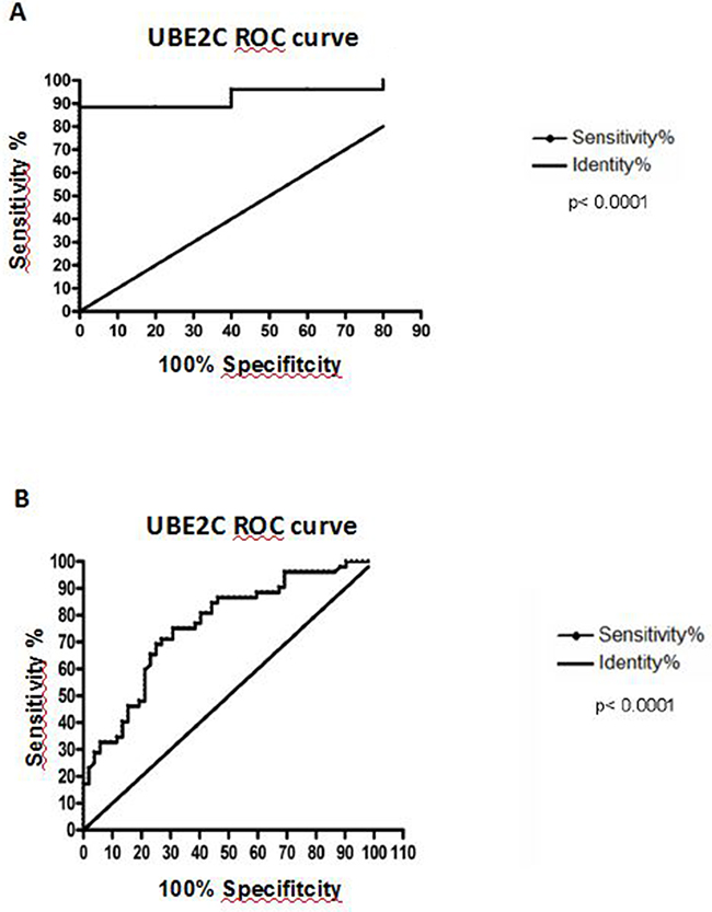 Aiming to evaluate whether UBE2C mRNA expression would be able to discriminate between tumor and non-tumor esophageal tissues, we performed the Receiver Operating Characteristc (ROC) curve using the gene expression values from the healthy esophageal tissues, tumor surrounding tissues and ESCC groups. The expression of UBE2C was able to accurately discriminate ESCC samples from normal (p<0.0001) and tumor surrounding tissues (p<0.0001), with sensitivity and specificity of, respectively, 88.46% and 100% (discrimination between ESCC and healthy esophageal tissue) and 71.15% and 73.08% (discrimination between ESCC and normal surrounding tissue) (Figure 3).