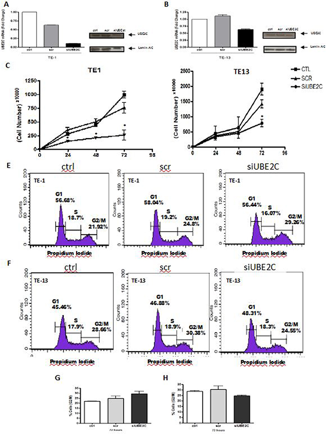 Figure 4: UBE2C silencing alters growth rates and cell cycle profile of ESCC cell lines. Analysis of UBE2C mRNA and protein levels by qRT-PCR and western blot, respectively, in TE-1 A. and TE-13 B. ESCC cells transfected with siRNA targeting UBE2C (siUBE2C) compared to those non-transfected (ctrl) and transfected with a siRNA scrambled sequence (scr). Proliferation rates and cell cycle profile ofTE-1 C. and E. TE-13 (D and F. cells transfected with siRNA targeting UBE2C (siUBE2C) compared to those non-transfected (ctrl) and transfected with a siRNA scrambled sequence (scr). Graphical representation of the percentage of TE-1 G. and TE-13 H. cellsin G2/M phase of the cell cycle analysis represented in Figures 4E and 4F. * p < 0.005