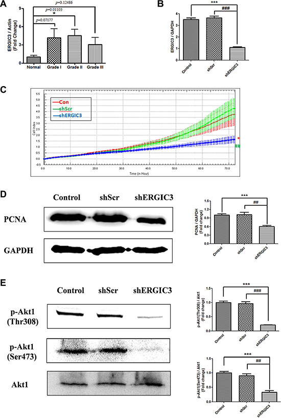 Figure 1: ERGIC3 expression in tumor tissues and effect of shERGIC3 downregulation. (A) Densitometric analysis of ERGIC3 protein on Western blot in human normal and adenocarcinoma lung tissues. Each bar indicates mean ± standard error of mean (SEM; n = 5). N, normal lung tissues; GI, grade I adenocarcinoma tissues; GII, grade II adenocarcinoma tissues; GIII, grade III adenocarcinoma tissues (*P < 0.05, compared to normal lung tissues). (B) Quantitative PCR (qPCR) analysis of ERGIC3. ERGIC3 downregulated stable cell line (shERGIC3) showed significant differences compared to control (***P < 0.001) or shScr (###P < 0.001) (n = 4). (C) Real-time cell proliferation analysis using xCELLigence RTCA DP system; 1 × 103 cells from control A549, shScr and shERGIC3 stable cell lines were seeded in 16-well E-plates, and incubated for 72 h (*P < 0.05, compared to control and ##P < 0.01, compared to shScr, n = 3). (D) Western blot and densitometric analyses of PCNA in A549 control, shScr and shERGIC3 stable cells (n = 4). (E) Western blot and densitometric analyses of p-Akt1 (Thr308 and Ser473). Significant differences are indicated by *P < 0.05, **P < 0.01 and ***P < 0.001 (*: compared to control, #: compared to shScr, n = 3).