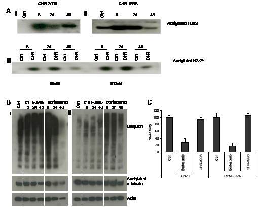 Figure 4: CHR-3996 treatment increases levels of acetylated histone H3K9 but does not affect levels of ubiquitinated proteins, acetylated alpha-tubulin, or inhibit proteasome function. A. H929 (i) and RPMI-8226 (ii) cells were treated with CHR-3996 (250 and 100 nM respectively) and primary patient CD138+ plasma cells (iii) were treated with either 50 (left panel) or 100 nM (right panel) CHR-3996 over a time-course of 48 hours. Following cell lysis histones were released from DNA by overnight extraction with 0.2M HCl and immunoblotting performed to detect acetylated H3K9. B. H929 (i) and RPMI-8226 (ii) cells were treated with CHR-3996 (250 and 100 nM respectively) or bortezomib (8nM) for 8, 24, and 48 hours. Following cell lysis immunoblotting was performed to detect ubiquitin, acetylated a-tubulin, and actin. Crtl represents untreated cells. C. H929 and RPMI-8226 cells were treated with CHR-3996 (250 and 100 nM respectively) or bortezomib (4 nM). Following cell lysis 25 µg of protein was added to Suc-Leu-Leu-Val-Tyr-AMC, substrate for the chymotryptic activity of the proteasome, and the fluoresence read from each well every 120 seconds for 48 repeats. The activity was calculated from the rate of fluorescence detected in the linear phase of the reaction and shown as a percentage of untreated cells.