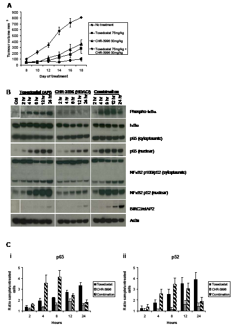 Figure 5: CHR-3996 is synergistic with Tosedostat (CHR-2797) in an in vivo model and causes rapid activation followed by down-regulation of NFκB signalling. A. NOD/SCID IL2R-/- mice were inoculated subcutaneously with 2x106 H929 cells. Four days following the inoculation mice were administered CHR-3996, tosedostat, or a combination of the two agents on a daily basis. The tumours were measured every other day with callipers. The median tumour volume (calculated by 1/2(length)(width)2) is shown on the graph, Each treatment group n=10. B. and C. H929 cells were treated with tosedostat (CHR-2797) (APi) 1 µM, CHR-3996 (HDACi) 250 nM, or both compounds simultaneously and cytoplasmic/nuclear protein extracts prepared at the times indicated in the figure for B. immunoblotting and C. an NFκB DNA binding assay for p65 (i) and p52 (ii).