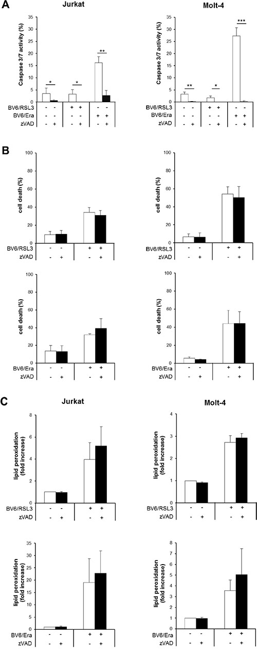 Figure 2: RSL3/BV6- or Erastin/BV6- cotreatment triggers caspase-independent lipid peroxidation-induced cell death. (A–C) ALL cells were treated with BV6 (Jurkat: 5 μM, Molt-4: 4 μM), RSL3 (Jurkat: 0.1 μM; Molt-4: RSL3 0.075 μM) and/or Erastin (Era) (Jurkat: 5 μM; Molt-4: 7.5 μM) in the presence or absence of 20 μM zVAD.fmk, which was added 2 hours before treatment. Caspase-3/7 activity was determined after 48 hours by Cell Event Caspase-3/7 Green Detection Reagent and ImageXpress Micro XLS system (A). Cell death was determined after 12 hours (Jurkat cells: Erastin/BV6) or 24 hours (Jurkat cells: RSL3/BV6, Molt-4 cells: RSL3/BV6, Erastin/BV6) by FSC/SSC analysis and flow cytometry (B). Lipid peroxidation was assessed after 18 hours (Erastin/BV6) or 24 hours (RSL3/BV6) by flow cytometry in PI-negative cells using the fluorescent dye BODIPY-C11 and is shown as fold increase compared to untreated cells (C). Mean and SD of at least three experiments performed in triplicate are shown; *P < 0.05; **P < 0.01; ***P < 0.001.