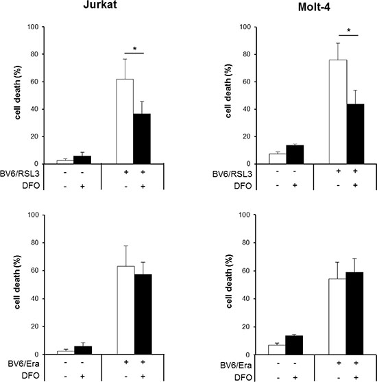 Figure 3: RSL3/BV6 but not Erastin/BV6 cotreatment triggers iron-dependent cell death. ALL cells were treated for 24 hours with BV6 (Jurkat: 5 μM, Molt-4: 4 μM), RSL3 (Jurkat: 0.1 μM; Molt-4: RSL3 0.075 μM) and/or Erastin (Era) (Jurkat: 5 μM; Molt-4: 7.5 μM) in the presence or absence of 25 μM DFO, which was added 2 hours before treatment. Cell death was determined by FSC/SSC analysis and flow cytometry. Mean and SD of at least three experiments performed in triplicate are shown; *P < 0.05.