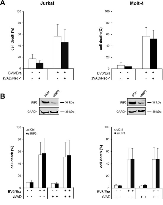 Figure 4: Erastin/BV6/zVAD.fmk cotreatment triggers RIP1- and RIP3-independent cell death. (A) ALL cells were treated for 24 hours with BV6 (Jurkat: 5 μM, Molt-4: 4 μM) and/or Erastin (Era) (Jurkat: 5 μM; Molt-4: 7.5 μM) in the presence or absence of 20 μM zVAD.fmk and 15 μM Nec-1, which were added 2 hours before treatment. Cell death was determined by FSC/SSC analysis and flow cytometry. Mean and SD of at least three experiments performed in triplicate are shown. (B) ALL cells were transiently transfected with siRNA against RIP3 or control siRNA and RIP3 protein expression was determined by Western blotting (upper panels). Cells were treated for 24 hours with BV6 (Jurkat: 5 μM, Molt-4: 4 μM) and/or Erastin (Jurkat: 5 μM; Molt-4: 7.5 μM) in the presence or absence of 20 μM zVAD.fmk, which was added 2 hours before treatment and cell death was determined by FSC/SSC analysis and flow cytometry (lower panels). Mean and SD of at least three experiments performed in triplicate are shown.