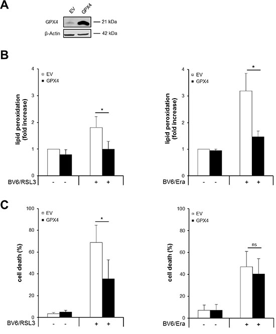 GPX4 overexpression inhibits RSL3/BV6- but not Erastin/BV6-induced cell death, while it prevents both RSL3/BV6- and Erastin/BV6-induced lipid peroxidation
