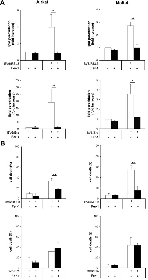 Figure 7: Fer-1 inhibits RSL3/BV6- but not Erastin/BV6-induced cell death, while it prevents both RSL3/BV6- and Erastin/BV6-induced lipid peroxidation. ALL cells were treated with BV6 (Jurkat: 5 μM, Molt-4: 4 μM), RSL3 (Jurkat: 0.1 μM; Molt-4: RSL3 0.075 μM) and/or Erastin (Era) (Jurkat: 5 μM; Molt-4: 7.5 μM) in the presence or absence of 5 μM Fer-1, which was added 2 hours before treatment. Lipid peroxidation was assessed after 12 hours (Jurkat: Erastin/BV6), 18 hours (Molt-4: Erastin/BV6) or 24 hours (Jurkat: RSL3/BV6, Molt-4: RSL3/BV6) by flow cytometry in PI-negative cells using the fluorescent dye BODIPY-C11 and is shown as fold increase (A). Cell death was determined by FSC/SSC analysis and flow cytometry (B). Mean and SD of three experiments performed in triplicate are shown; *P < 0.05; **P < 0.01.