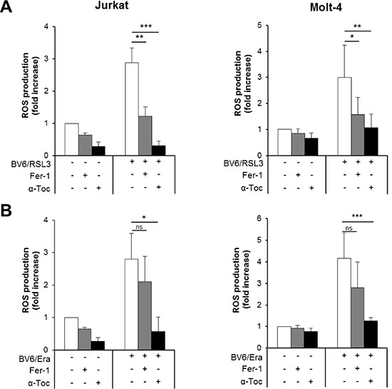 Figure 8: α-Toc rescues both RSL3/BV6- and Erastin/BV6-induced ROS production, whereas Fer-1 prevents RSL3/BV6- but not Erastin/BV6-stimulated ROS generation. ALL cells were treated with BV6 (Jurkat: 5 μM, Molt-4: 4 μM), RSL3 (Jurkat: 0.1 μM; Molt-4: RSL3 0.075 μM) and/or Erastin (Era) (Jurkat: 5 μM; Molt-4: 7.5 μM) in the presence or absence of 100 μM α-Toc or 5 μM Fer-1, which were added 2 hours before treatment. ROS production was determined after 15 hours by flow cytometry in PI-negative cells using the fluorescent dye CellROX and is shown as fold increase with mean and SD of three experiments performed in triplicate; *P < 0.05; **P < 0.01; ***P < 0.001.