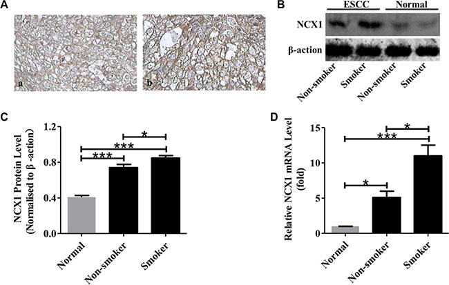 Figure 2: Relationship between NCX1 expression and smoking status of ESCC patients. (A) Representative immunohistochemistry analysis for NCX1 proteins in human ESCC tissues of non-smokers (a) and smokers (b). Original magnifications: ×400. (B) Representative Western blot analysis for NCX1 (top) and β-actin (bottom) in human ESCC tissues of smokers or non-smokers and their paired noncancerous normal tissues. β-actin was used as an internal standard. (C) A summary of Western blot data comparing the expression of NCX1 proteins in human ESCC tissues of smokers and non-smokers (n = 3). (D) A summary of qPCR data comparing the expression of NCX1 at transcriptional level in human ESCC tissues of smokers and non-smokers (n = 3). *P < 0.05, **P < 0.01 or ***P < 0.001 vs. normal (paired noncancerous normal tissues).