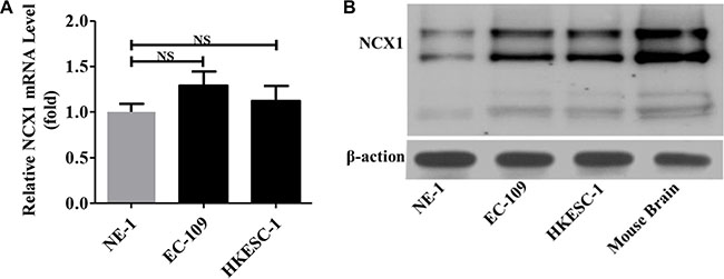 Figure 3: Expression levels of NCX1 in normal human esophageal epithelial cell line (NE-1) and human ESCC cell lines (EC-109 and HKESC-1). (A) The qPCR was performed to detect the expression of NCX1 at transcriptional level in cells (n = 3). NS: no significant differences. (B) Western blot analysis was performed to detect the expression of NCX1 at protein level in cells (n = 3). Mouse brain was used as a positive control, and β-actin was used as an internal standard.