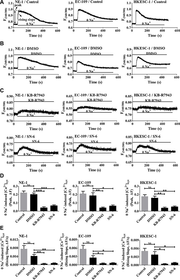 After expression of NCX1 was identified, we sought to characterize their function in human esophageal cells. To test whether NCX1 functions in the Ca2+ entry mode to transport external Ca2+ into cell, human esophageal cells (NE-1, EC-109 and HKESC-1) were initially superfused with normal solution, and afterwards switched to the solution without Na+ (0 Na+ by replacing Na+ with equimolar Li+ to increase a driving force for operation of the Ca2+ entry mode of NCX1). As shown in Figure 4A, a switch to 0 Na+ solution caused a rapid increase in [Ca2+]cyt. We analyzed both peaks and rising slopes of Ca2+ entry to quantitatively describe the NCX1 activity in the Ca2+ entry mode in cells. Since DMSO (0.1% of final concentration) was used as the solvent of all drugs, its effect was first tested, but it did not affect 0 Na+-induced [Ca2+]cyt signaling (Figure 4B). However, after extracellular application of KB-R7943 (10 μM) and SN-6 (10 μM), selective inhibitors of NCX1 especially in its Ca2+ entry mode, 0 Na+-induced [Ca2+]cyt was significantly attenuated (Figure 4C). Figure 4D and 4E summarize the inhibitory effects of KB-R7943 and SN-6 on 0 Na+-induced peaks and rising slopes of Ca2+ entry in the cells. These findings clearly demonstrate that NCX1 functions in the Ca2+ entry mode to transport external Ca2+ into human esophageal cells.