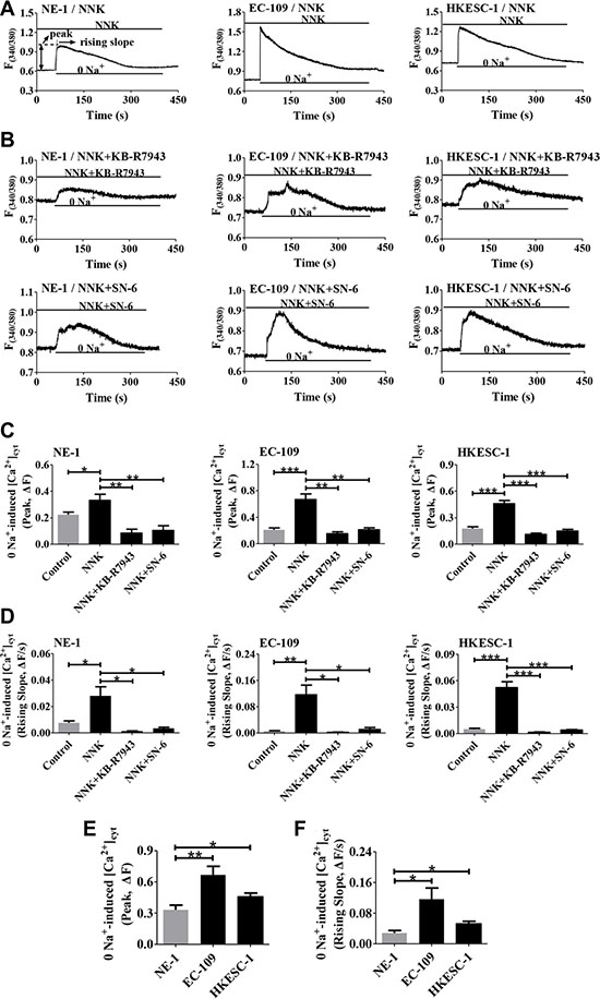 Figure 6: Effect of NNK on NCX1 function in human esophageal cell lines. (A) Representative original tracings showing removal of Na+ (0 Na+)-induced a rapid increase in [Ca2+]cyt in NNK-pretreated NE-1, EC-109 and HKESC-1 cells. (B) Representative original tracings showing the effects of KB-R7943 (10 μM) and SN-6 (10 μM) on 0 Na+-induced increase in [Ca2+]cyt in NNK-pretreated cells. (C and D) Summary data showing the effects of KB-R7943 and SN-6 on 0 Na+-induced peaks and rising slopes of [Ca2+]cyt in NNK-treated cells (n = 8). (E and F) Summary data comparing the effect of NNK on 0 Na+-induced peaks and rising slopes of [Ca2+]cyt in NE-1, EC-109 and HKESC-1 cells (n = 8). For all NNK-pretreated cells, they were pretreated with NNK (1 μM) for 16 h. *P < 0.05, **P < 0.01 or ***P < 0.001.