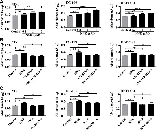 Figure 7: The involvement of NCX1 in NNK-promoted proliferation of human esophageal cell lines. (A) Summary data showing the effect of NNK at different concentrations on proliferation of NE-1, EC-109, and HKESC-1 cells (n = 4). (B) Summary data showing the effect of KB-R7943 (10 μM) on NNK (1 μM)-promoted cell proliferation (n = 4). (C) Summary data showing the effect of SN-6 (10 μM) on NNK (1 μM)-promoted cell proliferation (n = 4). NS: no significant differences. *P < 0.05, **P < 0.01 or ***P < 0.001.