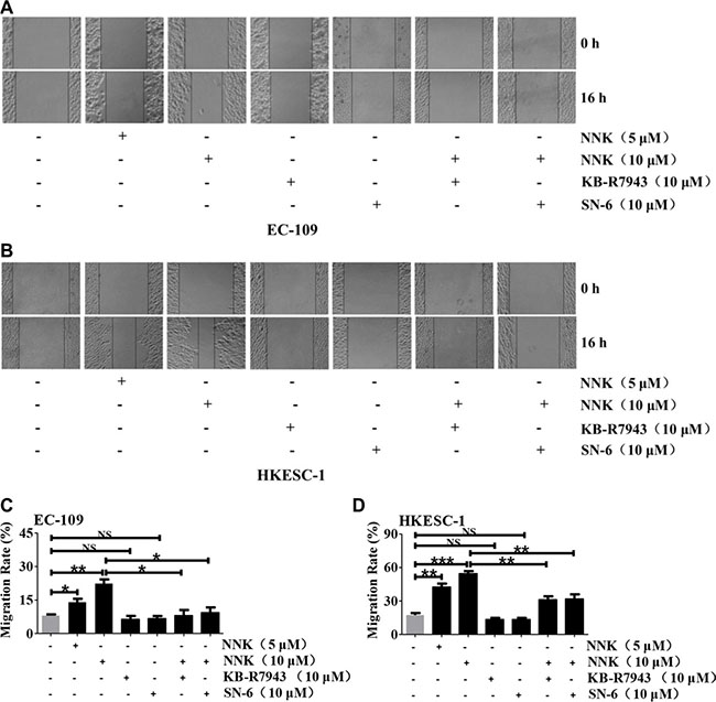Figure 8: The involvement of NCX1 in NNK-promoted migration of human ESCC cells. Representative scratch assays showing the effect of NNK at different concentrations on cell migration and the effects of KB-R7943 and SN-6 on NNK-promoted migration of EC-109 cells (A) and HKESC-1 cells (B). Summary data showing the effect of NNK at different concentrations on cell migration and the effects of KB-R7943 and SN-6 on NNK (10 μM) -promoted migration of EC-109 cells (C) and HKESC-1 cells (D). N = 3, NS: no significant differences, *P < 0.05, **P < 0.01 or ***P < 0.001.