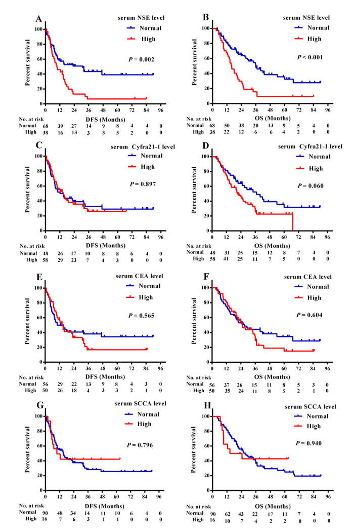 Serum concentrations of NSE, CEA, Cyfra21-1 and SCCA were measured within 2 weeks before surgery by electrochemiluminescence immunoassay on Roche Analytics E170 Immunology Analyzer (Roche Diagnostics, China). Based on the manufacturer’s recommendation, the following cut-offs for serum marker levels were used: NSE 15.2 ng/ml, CEA 5.0 ng/ml, Cyfra21-1 3.3 ng/ml and SCCA 1.5 ng/ml.