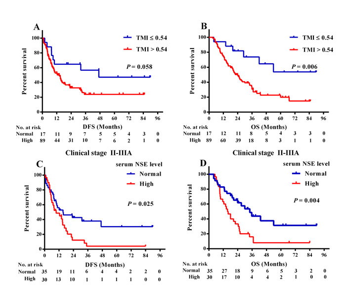 Figure 2: Kaplan-Meier survival curves of DFS and OS based on TMI as well as NSE levels. A. DFS and B. OS based on different levels of TMI. C. DFS and D. OS based on different NSE levels in stage II-IIIA patients (n = 65).