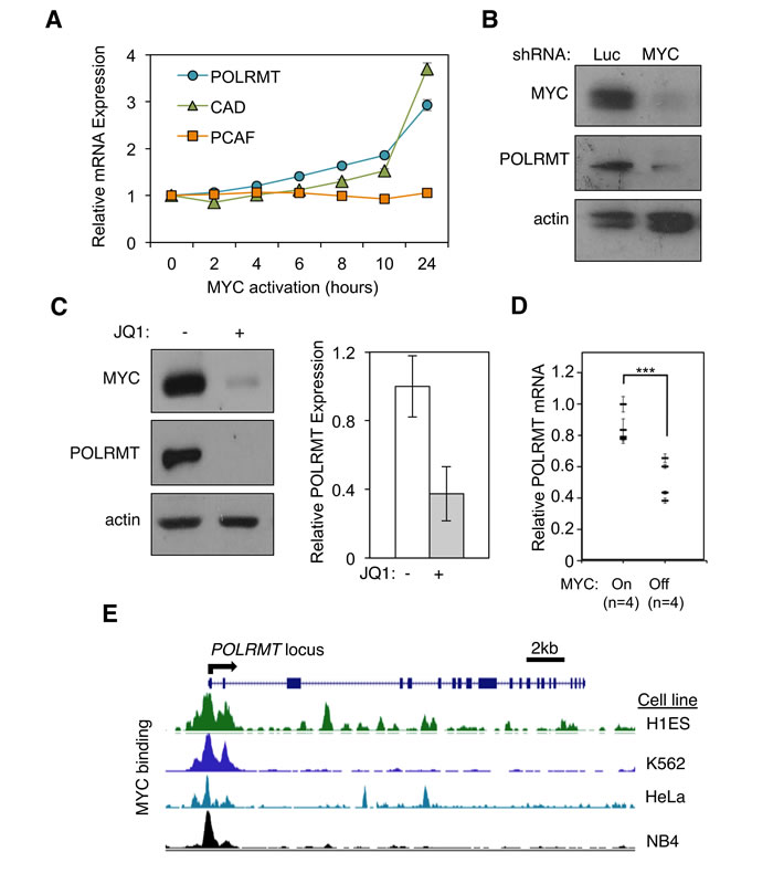 Figure 1: POLRMT is a direct transcriptional target of the MYC oncoprotein. A. 2091 MYC/ER cells were treated with 4-hydroxytamoxifen (4-OHT) to induce MYC activity. Cells were harvested at the indicated time points and analyzed by quantitative real-time PCR (qRT-PCR) to show the kinetics of gene induction. Error bars represent SD, n = 3. B. H1299 cells were infected with lentiviral MYC shRNA or Luciferase (Luc) shRNA as a control. Cells were harvested and whole cells lysates were analyzed by Western blot for the indicated proteins. C. Raji cells were treated with JQ1 to deplete MYC levels. Cells were harvested and whole cell lysates were analyzed by Western blot (left) for the indicated proteins and qRT-PCR (right) for POLRMT expression. Error bars represent SD, n = 3. D. Mammary tumors were induced in six week old female bitransgenic MMTV-rtTA;TetO-MYC mice via administration of 2 mg/mL doxycycline in drinking water. After mammary tumor formation, doxycycline was withdrawn from the water of 4 mice (MYC OFF) while the other mice were maintained on doxycycline (MYC ON). 96 hours after doxycycline withdrawal, tumors were harvested and mRNA analyzed by qRT-PCR. Error bars represent SD, n = 4. ***p < .001 Student’s t-test (two-sided). E. Modified image taken from UCSC genome browser (Assembly GRCh37/hg19) ENCODE transcription factor ChIP track showing MYC binding at the POLRMT locus in a variety of cell lines (http://genome.ucsc.edu).