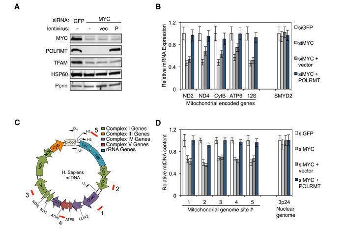 Figure 2: MYC regulates mitochondrial transcription and mtDNA replication via POLRMT. A. H1299 cells were transfected with MYC siRNA or GFP siRNA as a control. 24 hours post-transfection, one group of MYC depleted cells was infected with lentivirus expressing human POLRMT (P) or the empty vector (vec). Three days post-transfection, cells were harvested and mitochondrial proteins POLRMT, TFAM, HSP60 and Porin were measured from purified mitochondria. The level of MYC depletion was evaluated from whole cell lysates. B. Cells described in (A) were analyzed by qRT-PCR for mitochondrial gene expression. Nuclear gene SMYD2 was used as a control. Error bars represent SD, n = 3. C. Map of the human mitochondrial genome indicating ORF, tRNA, rRNA and gene locations. Locations of the primer sets used for quantifying mtDNA genome in (D) are indicated (red bars labeled 1-5). D. Total cellular DNA from cells described in (A) was quantified by qPCR using primer sets shown in (C). Primers amplifying a region at 3p24 were used to validate the specificity of the mitochondrial/nuclear comparison. Error bars represent SD, n = 3.