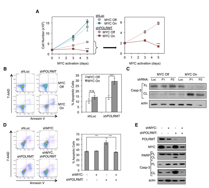 Figure 3: Synthetic Lethal Dependency of Deregulated MYC on POLRMT. A. U2OS MYC/ER cells were infected with lentiviral POLRMT shRNA or Luciferase (Luc) shRNA as a control. Five days post-infection cells were seeded at equal densities and MYC activity was induced via treatment with 4-OHT (MYC On). Cells were counted on day three and day five post MYC-activation. shPOLRMT cell counts are shown with an adjusted scale (right). Error bars represent SD, n = 3. ***p < .001, Unpaired t-test. B. U2OS MYC/ER cells were depleted of POLRMT and treated with 4-OHT (MYC On), as in (A). Cells were harvested on day three post MYC-activation and stained with Annexin V and 7-AAD. A representative flow cytometry analysis (left) and quantification of the percent Annexin V positive cells (right) are shown. Error bars represent SEM, n = 18. ***p < .001; n.s., not significant, Unpaired t-test. C. U2OS MYC/ER cells were infected with two distinct lentiviral POLRMT shRNA plasmids (P1 and P2) or shLuc. Five days post-infection MYC was activated via treatment with 4-OHT (MYC On). Cells were harvested three days post MYC activation and whole cell lysates were analyzed by Western blot for the indicated proteins. D. HCT116 cells were infected with lentiviral POLRMT shRNA and/or MYC shRNA, or Luciferase shRNA. Five days post-infection cells were harvested and stained with Annexin V and 7-AAD. A representative flow cytometry analysis (left) and quantification of percent of Annexin V positive cells (right) is shown. Error bars represent SEM, n = 3. **p < .01; n.s., not significant, Unpaired t-test. E. Whole cell lysates of cells described in (D) were analyzed by Western blot for the indicated proteins. Casp-3, caspase-3; FL, full length; CL, cleaved.