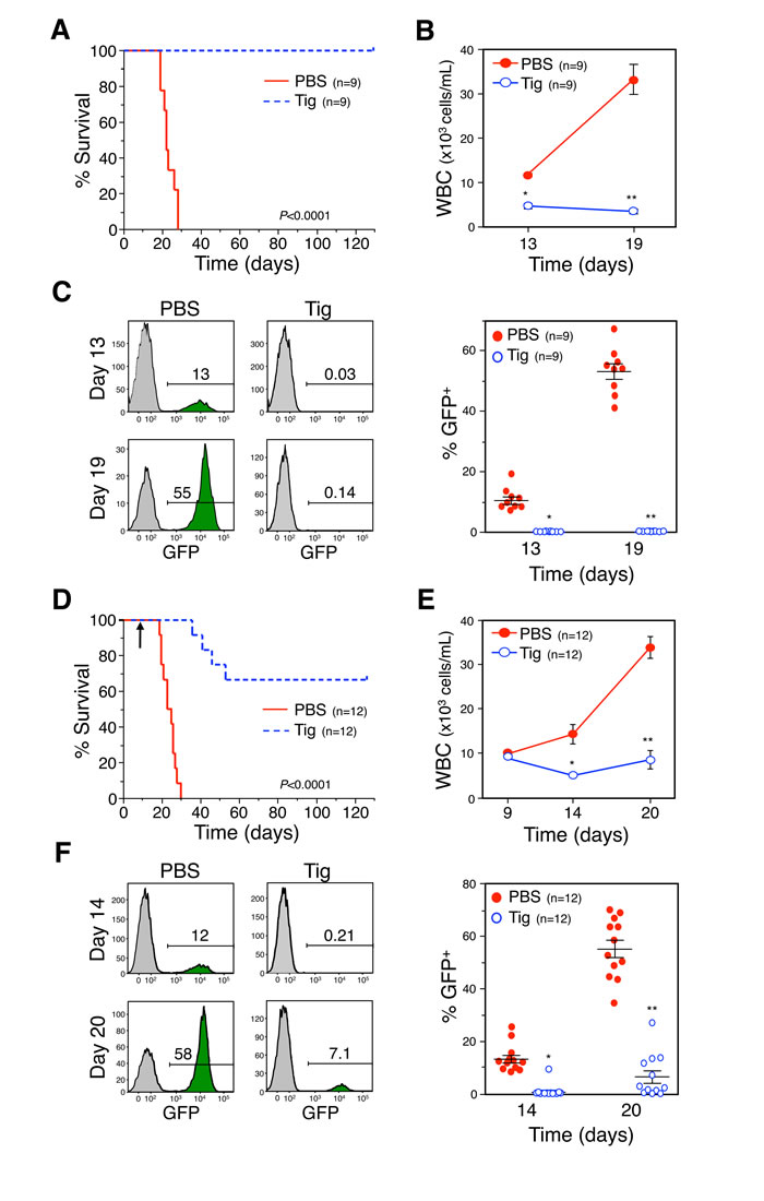 Figure 6: Tigecycline inhibits B cell lymphoma, in vivo, prolonging survival. A. and D. Kaplan-Meier survival curves of C57Bl/6 mice injected intravenously with GFP-expressing Eµ-myc lymphoma cells and administered tigecycline (Tig) or PBS (vehicle control) starting the day of injection (A, p < 0.0001, log-rank test) or once the lymphoma had established on day nine indicated by an arrow (D, p < 0.0001, log-rank test). B. and E. For the mice in A and D, respectively, white blood cell counts (WBC) and GFP positive cells (lymphoma) in the blood, as measured by flow cytometry (C and F, respectively), were determined on the days indicated. The number (n) of mice in each group is indicated. B, *P = 4.43x10-6, **P = 1.57x10-5; C, *P = 1.58x10-5; **P = 1.57x10-8; E, *P = 7.23x10-4, **P = 9.42x10-6; F, *P = 4.77x10-7; **P = 4.02x10-9; t-tests.