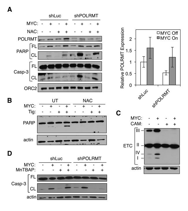 Figure 7: Mitochondrial gene expression protects MYC-overexpressing cells from toxic levels of ROS. A. U2OS MYC/ER cells were infected with lentiviral POLRMT shRNA or Luciferase (Luc) shRNA and treated with NAC. MYC activity was induced via 4-OHT treatment (MYC On). Three days post-treatment cells were harvested and whole cell lysates were analyzed by Western blot for the indicated proteins (left). Relative mRNA expression was measured by qRT-PCR (right). Error bars represent SD, n = 3. B. U2OS MYC/ER cells were treated with tigecycline (Tig) and/or NAC. MYC activity was induced via 4-OHT treatment. Three days post-treatment cells were harvested and whole cell lysates were analyzed by Western blot for the indicated proteins. C. U2OS MYC/ER cells were treated with chloramphenicol (CAM). MYC activity was induced via 4-OHT treatment. Whole cell lysates were analyzed by Western blot using an antibody cocktail for subunits of electron transport chain (ETC) complexes, as indicated (I-IV). D. U2OS MYC/ER cells were infected with lentiviral POLRMT shRNA or Luciferase (Luc) shRNA and treated with MnTBAP. MYC activity was induced via 4-OHT treatment. Three days post-treatment cells were harvested. Whole cell lysates were analyzed by Western blot for the indicated proteins. Casp-3, caspase-3; FL, full length; CL, cleaved; UT, untreated.