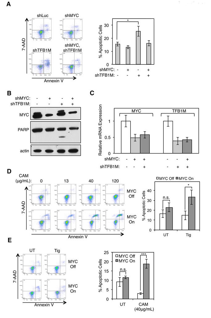 Figure 5: Inhibition of mitochondrial translation phenocopies synthetic lethality resulting from POLRMT inhibition. A. HCT116 cells were infected with lentiviral MYC shRNA and/or TFB1M shRNA or Luciferase (Luc) shRNA. Five days post-infection cells were harvested and stained with Annexin V and 7-AAD. A representative flow cytometry analysis (left) and quantification of percent Annexin V positive cells (right) is shown. Error bars represent SEM, n = 5. *p < .05; n.s., not significant, Unpaired t-test B. Whole cell lysates of cells described in (A) were analyzed by Western blot for indicated proteins. C. Relative mRNA expression of cells described in (A) was measured by qRT-PCR. Error bars represent SD, n = 5. D. U2OS MYC/ER cells were treated with increasing concentrations of chloramphenicol, as indicated. MYC activity was induced via treatment with 4-OHT (MYC On). Three days post MYC-activation cells were harvested and stained with Annexin V and 7-AAD (left). Quantification of percent Annexin V positive cells at 40µg/mL dose is shown (right). Error bars represent SEM, n = 8. ***p < .0001; n.s., not significant, Unpaired t-test E. U2OS MYC/ER cells were treated with 10µM tigecycline (Tig) and MYC activity was induced via treatment with 4-OHT (MYC On). Three days post MYC-activation cells were harvested and stained with Annexin V and 7-AAD. A representative flow cytometry analysis (left) and quantification of percent Annexin V positive staining cells (right) is shown. Error bars represent SEM, n = 7. *p < .05; n.s., not significant, Unpaired t-test. UT, untreated.