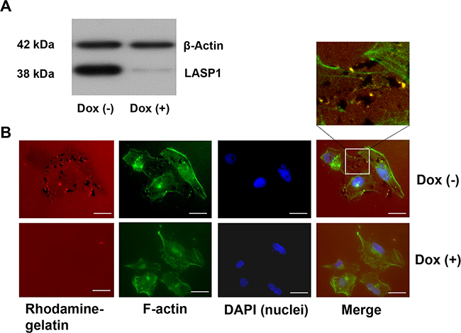 Figure 1: Knockdown of LASP1 decreases matrix degradation capacity of invadopodia in human breast cancer cells. A. Western Blot analysis of LASP1 and β-actin (loading control) of MDA-MB-231-shLASP1 cells before and after doxycycline treatment. B. Representative omnifocal microscopy of stably transfected MDA-MB-231shLASP1 cells before (Dox(-)) and after LASP1 knockdown (Dox(+)), seeded on rhodamine-labeled gelatin, fixed after 20h and stained for F-actin with Oregon Green 448 phalloidin and DAPI. Matrix degradation is visible as dark spots by concomitant loss of the fluorescent label. For merged Dox (-) images, a high magnification with yellow spotted invadopodia is shown. Scale bars represent 20 μm.