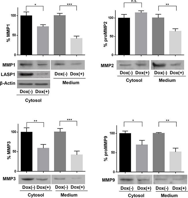 Figure 3: Loss of LASP1 impairs matrix metalloproteinases secretion by breast cancer cells. Cell lysate and adapted corresponding serum-free conditioned medium were harvested from MDA-MB-231-shLASP1 untreated control cells (Dox (-)) and LASP1 knockdown cells (Dox (+)) and subjected to Western blot analysis using MMP-specific antibodies. Representative blots are shown. The LASP1 knockdown and β-actin control shown for MMP1 expression applies to all other blots as well. Bar graphs summarize the results of five independent experiments (*p<0.05; **p<0.01; ***p<0.001; n.s. not significant). Compared to control cells, knockdown cells showed relative less abundant protein levels in the conditional medium and the cell lysate.