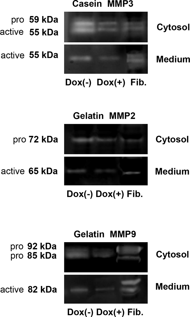 Gel zymography with gelatin as a substrate can identify the latent (proMMP2: 72 kDa; proMMP9: 92 kDa) and active (MMP2: 65 kDa; MMP9: 82 kDa) gelatinases (Figure 5, middle and lower panel, respectively). A reported 85 kDa pro-form of MMP9 in breast tumor cells, lacking complex carbohydrates [30], is also visible in our zymograms while control fibroblasts solely exhibit the 92 kDa pro-form band. Only the active forms are detected in the conditioned medium.