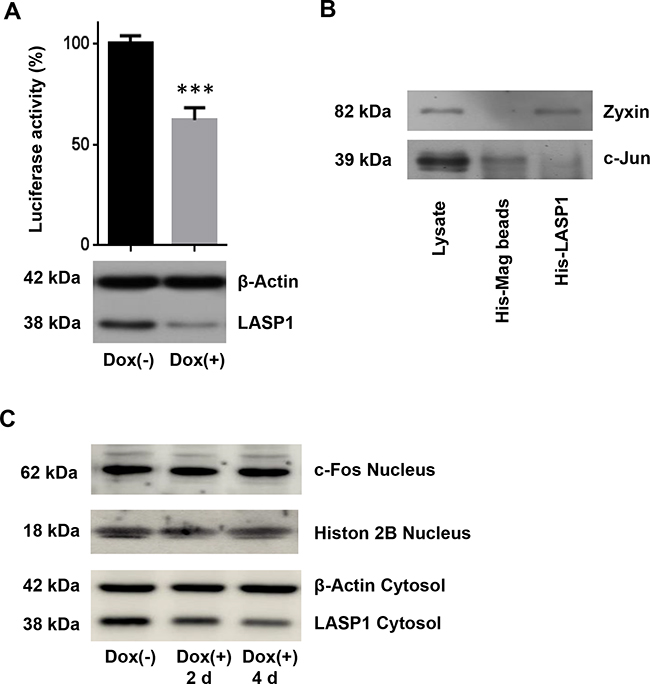 Figure 6: Luciferase reporter assay for AP-1 transcriptional activity and His-LASP1 pulldown. A. MDA-MB-231-shLASP1 cells, pre-treated 3 days with or without doxycycline, were infected with AP-1 binding site reporter lentiviruses to detect endogenous AP-1 activity, and with Renilla-luciferase plasmids for internal standard. Equal numbers of cells were then analyzed for both, firefly and Renilla luciferase activity. Data presented show firefly luciferase activity after normalization with Renilla luciferase and further normalized to control; *** p<0.001 (n =3). Data show reduced AP-1 activity after LASP1 knockdown. B. Western blot analysis of c-Jun after His-tagged LASP1 pulldown in MDA-MB-231-shLASP1 cell lysate. Specific binding of zyxin to LASP1 served as positive control. No specific binding of c-Jun to LASP1 is observed. C. Western blot analysis of c-Fos expression in MDA-MB-231-shLASP1 nuclear extract after 2 and 4 days of doxycycline treatment. LASP1 knockdown is not affecting c-Fos protein concentration. A representative blot of three independent experiments is shown. Histon 2B served as nuclear loading control. Western blot analysis of the cytosolic fraction revealed time-dependent LASP1 knockdown. β-actin served as cytosolic loading control.
