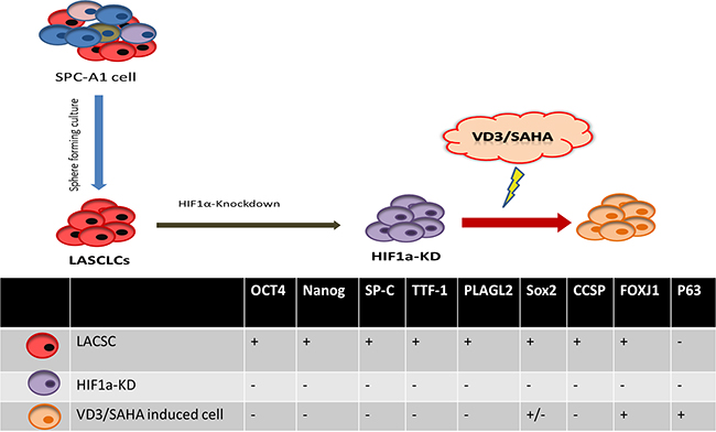 In this study, the differentiation of LACSCs was carried out in two phases (Figure 1). First, we stably knocked down HIF1α expression in SPC-A1 lung adenocarcinoma cells by HIF-1α shRNA lentiviral particles, which resulted in changing the stem-like cells to an intermediate differentiated state (named HIF1α-KD). In the second stage, we treated HIF1α-KD cells with vitamin D and SAHA, which transformed these cells into P63 and FOXJ1 positive differentiated cells (Figure 1). It should be noted that SPC-A1 cells expressed vitamin D receptor (VDR) (Supplementary Figure S1).