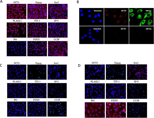 Figure 2: Immunofluorescent staining images of LACSC marker expression before and after each stage of differentiation. A. Cell marker expression of OCT4, Nanog, Sox2, PLAGL2, TTF-1, SP-C, P63, FOXJ1, and CCSP protein expression in parental LACSCs (SPC-A1 spheroid cells); B. OCT4 and HIF1α expression and Hoechst nuclear staining in LACSCs (upper panels) and HIF1α-KD cells (lower panels); C. cell marker expression in HIF1α-KD cells; D. marker expression in HIF1α-KD-SAHA/VD3 induced cells. All images were taken at 200x magnification. Figure 2B images were enlarged digitally to visualize individual cells more clearly for protein subcellular localization.