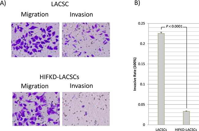 Figure 3: Migration and invasion activities of LACSCs and HIF1α-KD cells. A. Crystal violet staining of LACSCs and HIF1α-KD cells showing migration (left) and invasion (right) activities. B. Invasion rate of LACSCs and HIF1α-KD cells. Results are averages of 3 replicates.