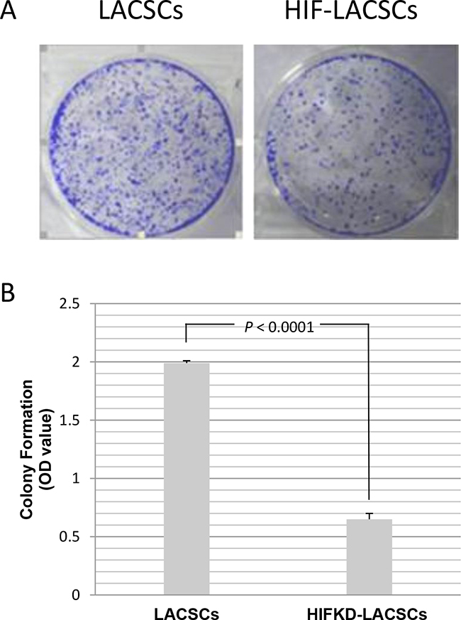 Colony formation assay showed that the number of foci of HIF1α-KD LACSC were significantly less than that of LACSCs (Figure 4A). Measurement of crystal violet staining confirmed the results showing the optical density (OD) of LACSCs was 1.99±0.02, while the OD was 0.65±0.05 for HIF1α-KD LACSCs (Figure 4B) (P<0.0001).