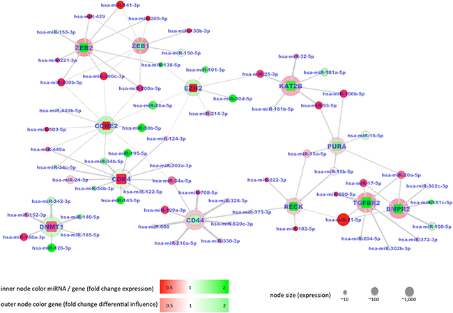 In the latter case, the 12 correctly predicted genes have validated interactions with 64 miRNAs. The resulting interaction network with changes in mRNA abundance associated with changes of miRNA abundance contains 12 target genes including CD44, ZEB1, ZEB2, BMPR2, RECK, TGFBR2, PURA and KAT2B as correctly predicted down-regulated genes, and DNMT1, CCNE2, CDK4, and EZH2 as correctly predicted up-regulated genes in tumor tissue. A false prediction was only made for the up-regulated gene HIF1A, which is predicted as down regulated according to our model. The interaction network shown in Figure 6 demonstrates the different patterns of miRNA - mRNA relations: Down-regulation of CD44, ZEB1 or ZEB2 appears to be induced by several miRNAs, which show a low abundance. Up-regulation of CDK4 can be mainly attributed to miR-195-5p and miR-145-5p, both of which show a high abundance. All but one of the 64 miRNAs is belonging to pathways in cancer and negative regulation of apoptotic processes, as annotated in KEGG (Supplementary Table S6).