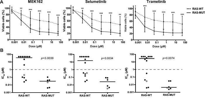 Figure 2: Primary RAS-mutant MLL-rearranged ALL cells are sensitive to MEK inhibitors. A. Patient derived t(4;11)+ infant ALL cells exposed to MEK inhibitors indicate RAS-mutant samples (solid line, n=6) are more sensitive compared to RAS-wildtype samples (dashed line, n=14). Data are represented as median +/- sd. *0.01<p<0.05; **0.001<p<0.01; ***p<0.001. B. The IC50 (concentration needed to inhibit 50% of the leukemic cell viability) of the individual t(4;11)+ infant ALL patient samples shown in A. Median IC50 values, represented by horizontal bars, confirm strong sensitivity of RAS-mutant patient samples compared to the majority of RAS-wildtype samples. Open circles indicate matched diagnosis (wildtype) and relapse (mutant) samples. The tick lines indicate separation between MEK inhibitor sensitive and resistant patient samples (IC50<1μM and IC50>1μM, respectively).
