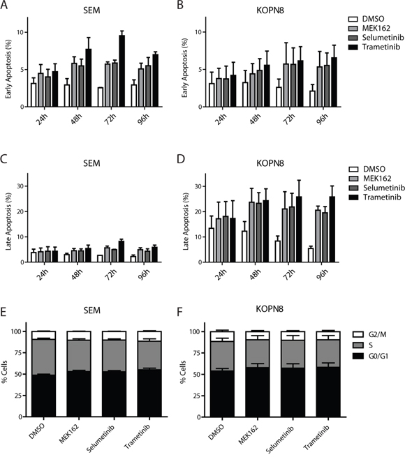 Figure 5: MEK inhibitors induce apoptosis. A. and B. Early apoptosis (percentage AnnexinV single positive of total) of SEM and KOPN8 cells (respectively) after exposure to DMSO vehicle (white bars) or 500 nM MEK162, Selumetinib or Trametinib (light grey, dark grey and black bars, respectively), indicates MEK inhibition slightly induces early apoptosis. Data are represented as mean +/- sem. n=3. C. and D. Late apoptosis (percentage AnnexinV and 7-AAD double positive cells of total) of SEM and KOPN8 (respectively) show that while SEM cells have no induction of late apoptosis in response to MEK inhibition, compared to the DMSO controls, KOPN8 clearly undergoes apoptosis, especially after prolonged exposure (>48 hours). Data are represented as mean +/- sem. n=3. E. and F. Cell cycle analysis of SEM and KOPN8 (respectively) after 96 hours exposure to vehicle (DMSO) or 500 nM MEK162, Selumetinib or Trametinib indicates MEK inhibition does not impinge on the cell cycle progression. Stacked bar graph indicates percentage of cells in G0/G1 (black), S (grey) and G2/M (white) cell cycle stages. Data are represented as mean +/- sem. n=3.