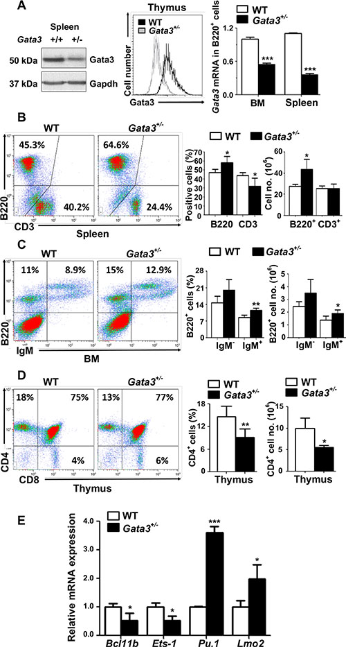 Figure 1: Haploid loss of Gata3 enhances B cell populations in the bone marrow and spleen, but reduces T cell populations in the thymus. (A) Tissues from the spleen or thymocytes of WT and Gata3+/− mice at 2 months of age were analyzed for Gata3 expression by Western blot (left panel) and flow cytometry (middle panel). Sorted B220+ B cells from the BM or spleen were analyzed for Gata3 expression by Q-RT-PCR (right panel). Data represent the mean ± SD from triplicates of 2 mice per genotype. (B–D). Cells from the spleen, BM and thymus of WT (n = 5) and Gata3+/− (n = 5) mice at 2 months of age were analyzed by flow cytometry. Representative profiles are shown. no., number. (E) mRNA levels of the indicated genes in thymocytes from WT and Gata3+/− mice at 2 months of age were determined by Q-RT-PCR. Data represent the mean ± SD from triplicates of 3 mice per genotype.