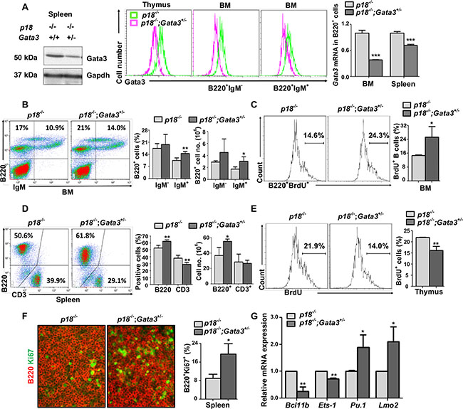 p18−/−;Gata3+/− thymocytes, splenocytes, B220+IgM- immature B and B220+IgM+ mature B cells in BM, expressed less Gata3 mRNA and protein than p18−/− cells (Figure 3A and Supplementary Figure S1B). Consistently, we also observed that in the BM, Gata3+/− B220+IgM- and B220+IgM- cells expressed less Gata3 than WT counterparts (Supplementary Figure S1C). We determined lymphocyte distribution in 2-month-old mice and found that p18−/−;Gata3+/− spleen and BM displayed significantly more B220+ and B220+IgM+ cells than p18−/− counterparts, respectively (Figure 3B, 3D, and Supplementary Table S1). Although the percentages of CD3+ splenocytes and CD4+ thymocytes in p18−/−;Gata3+/− mice were significantly reduced when compared with p18−/− mice (29.1% ± 2.9% vs. 38.1% ± 4.4% for CD3+ splenocytes, p = 0.005, 8.6% ± 1.3% vs. 11.8% ± 2.3% for CD4+ thymocytes, p = 0.03, Figure 3D and Supplementary Table S1), the absolute number of these cells in p18−/−;Gata3+/− mice, CD4+ thymocytes in particular, was not significantly decreased (Figure 3D and data not shown). In line with the findings derived from Gata3+/− thymocytes (Figure 1E), we also detected a significantly increased expression of Pu.1 and Lmo2, as well as significantly decreased expression of Ets-1 and Bcl11b in p18−/−;Gata3+/− thymocytes relative to those in p18−/− counterparts (Figure 3G). Together, these results suggest that haploid loss of Gata3 in p18 null mice promotes B cell development in the BM and spleen. How Gata3 deficiency impacts T cell development in a p18 null background needs further investigation.