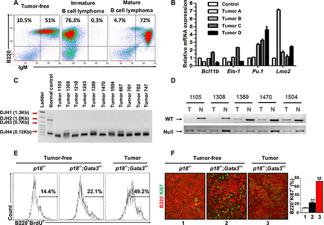 Figure 5: Characterization of lymphomas developed in p18−/−;Gata3+/− mice. (A) Representative lymphomas from p18−/−;Gata3+/− mice at 14–16 months of age were analyzed by FACS with the indicated antibodies. Age-matched spleens from tumor-free mice of the same genotype were used as control. (B) Q-RT-PCR analysis for cells derived from four representative p18−/−;Gata3+/−lymphomas. Splenocytes from the age-matched, lymphoma-free mice of the same genotype were used to normalize the expression for each gene. Data represent the mean ± SD from triplicate experiments. (C) DJ rearrangement of the heavy chain of immunoglobulin in DNA from p18−/−;Gata3+/− lymphomas was determine by PCR. DNA from a WT spleen with polyclonal B-cell populations was shown as a control. (D) Loss of heterozygosity analysis of representative p18−/−;Gata3+/− lymphomas. DNA isolated from microdissected lymphomas or ear tissues from the same mice were analyzed by PCR. (E) Representative BrdU incorporation in cells from a p18−/−;Gata3+/− lymphoma (Lane 3) and splenocytes from the age-matched (14–6 months), p18−/− (Lane 1) and p18−/−;Gata3+/− (Lane 2) lymphoma-free mice. (F) Immunofluorescence staining of Ki67 (green, nuclear staining) and B220 (red, membrane staining) in spleens from p18−/− (Lane 1) and p18−/−;Gata3+/− (Lane 2) lymphoma-free mice and a p18−/−;Gata3+/− lymphoma (Lane 3). The percentages of Ki67+ cells were calculated from B220+ cells and quantitated in five randomly selected fields in splenic sections, and the results represent the mean ± SD of three animals per group.