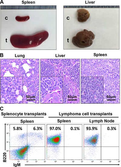 We then transplanted two million cells isolated from a p18−/−;Gata3+/− splenic lymphoma (immature B-cell lymphoma) or an asymptomatic spleen into each female NSG mouse (n = 3 for each group) by tail vein injection. After one month, all mice that received lymphoma cell transplants exhibited clinical signs of illness such as hunched posture, loss of appetite, ruffled fur and dyspnea whereas no symptoms were observed in mice that received control splenocytes. Necropsy and histological analysis revealed that mice that received lymphoma cell transplants displayed marked lymphadenopathy and enlarged spleens, with tumor cells infiltrated into multiple non-lymphoid organs including liver and lung (Figure 6A, 6B). Flow cytometry analysis showed that more than 90% of cells from spleen, lymph node, and BM of the lymphoma cell transplants exhibited aberrant B220+ IgM− cell populations (Figure 6C), which were comparable with the populations in the donor lymphoma (Figure 5A, middle panel). No mice received control splenocytes displayed similar flow cytometry profiles in splenocytes (Figure 6C). Together, these results demonstrate that p18−/−;Gata3+/− lymphoma cells are transplantable and highly tumorigenic into secondary immunodeficient mice.