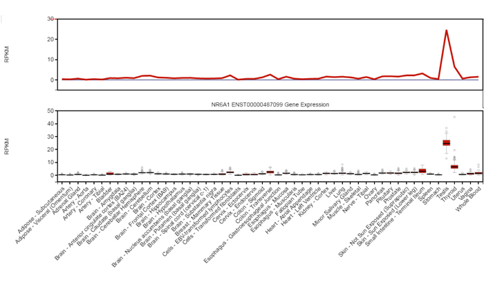 Figure 1: RNA-seq data from human multiple organs demonstrates the testis specific expression of NR6A1. From GTEx database ( V6 dbGaP Accession phs000424.v6.p1).
